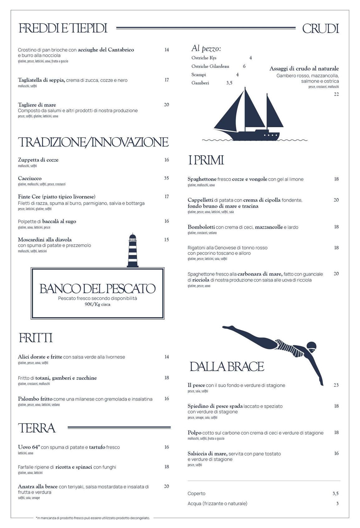 In un ambiente suggestivo e allo stesso tempo familiare, il ristorante di pesce propone specialità della cucina tipica livornese con antipasti, primi e secondi accompagnati da eccellenti vini toscani. Tutti i giorni potrete gustare il nostro caciucco preparato con il pescato del giorno locale. Fra le nostre proposte, oltre al pesce cotto e ai fritti, specialità al forno e alla griglia, crudité tra cui carpacci, molluschi e tartare.